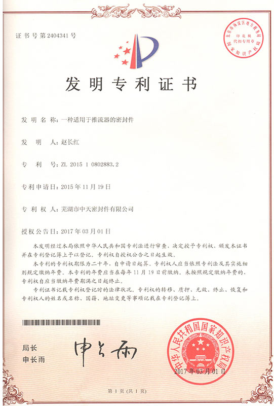 : 一種磁懸浮節能鼓風機機械密封件發明專利證書